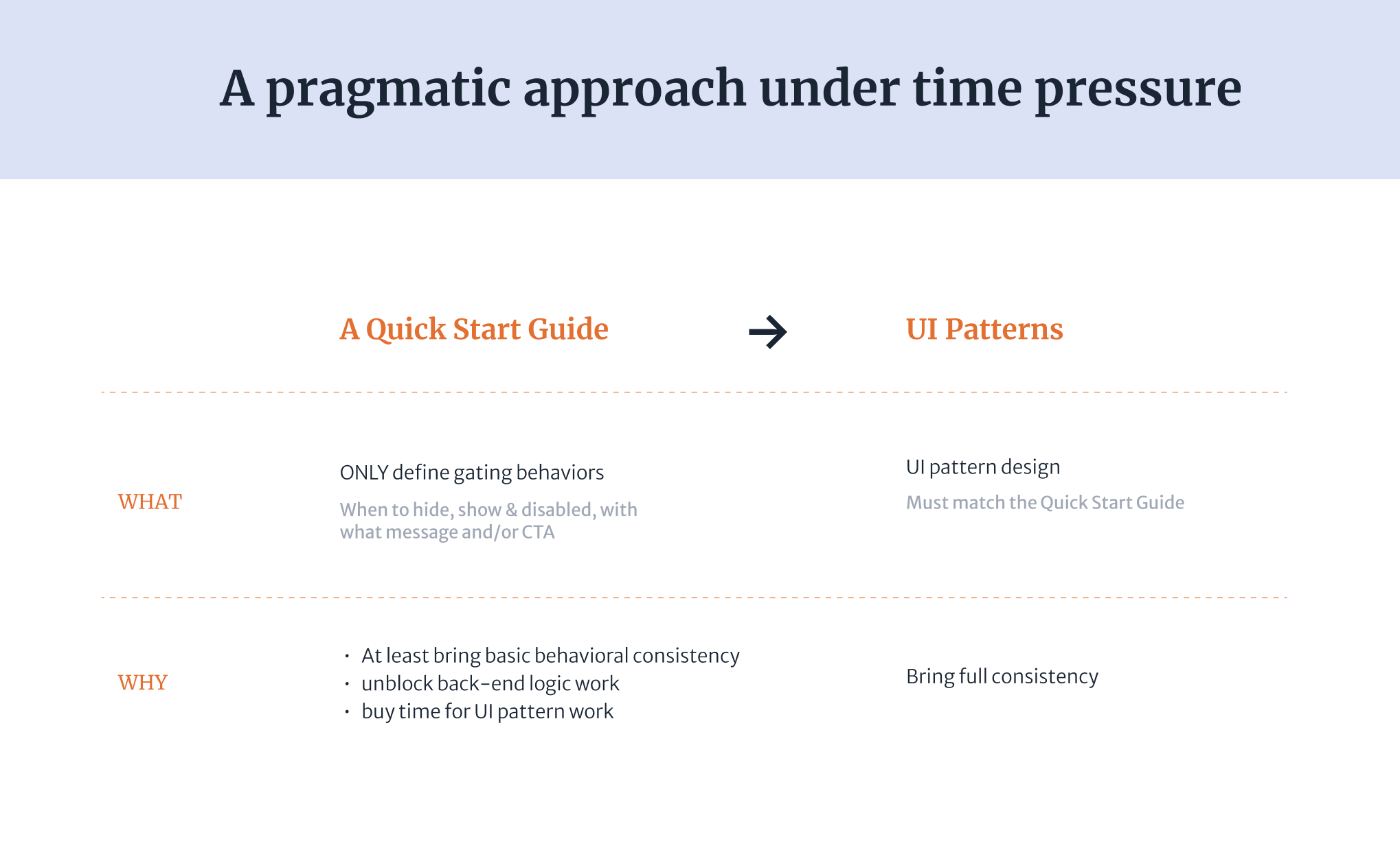 The approach starts with a Quick Start Guide — defining when features should be hidden, shown, or disabled — to establish baseline behavioral consistency and unblock back-end work immediately. This buys time for phase two: UI Patterns that translate those rules into fully consistent visual treatments across the product.